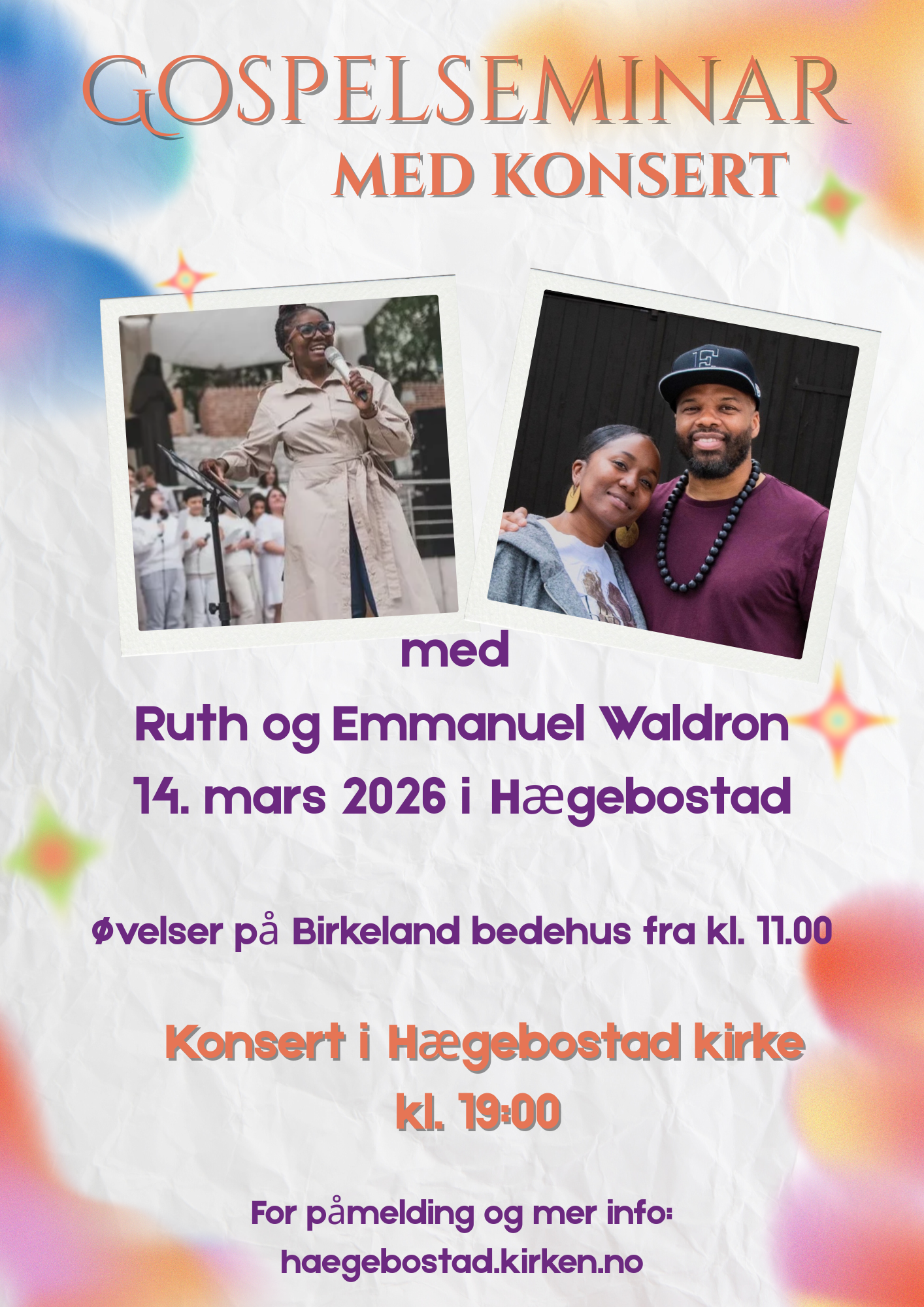 Bli med på vårens gospelhappening i Hægebostad! En fantastisk inspirerende kordag med profesjonelle instruktører som vi avslutter med en herlig konsert i Hægebostad kirke.